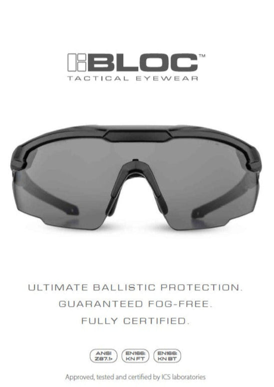 Discover Bloc Tactical Ballistic Eyewear's impressive specifications by clicking below. Unrivalled protection, performance, and comfort meets cutting-edge features like ballistic-rated lenses, lightweight frames, and advanced optics. Anti-fog coatings tailored for tactical environments ensure your visual experience and safeguard your eyes with Bloc's expertise. Download brochure for detailed specifications.